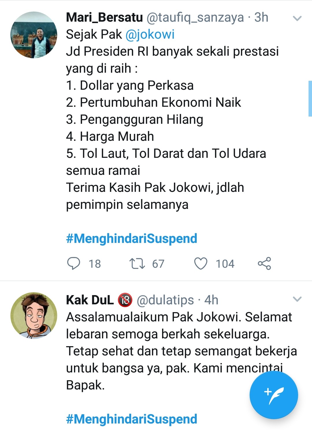 MONITOR, Jakarta – Media Sosial hari ini mendadak dihiasi ribuan postingan netizen yang berisi untaian pujian bagi Presiden Joko Widodo. Pemandangan ini tampak aneh, apalagi dalam postingan yang diunggah disusupi tagar #MenghindariSuspend.