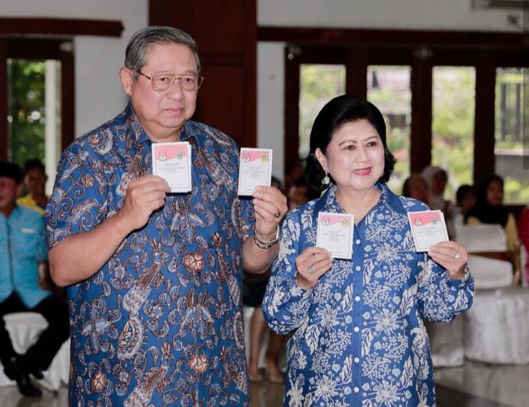 Terlihat SBY dan sang istri Ani Yudhoyono melakukan pemungutan suara di kediamannya Cikeas, Bogor, Jawa Barat. Keduanya tampak kompak mengenakan batik biru senada.