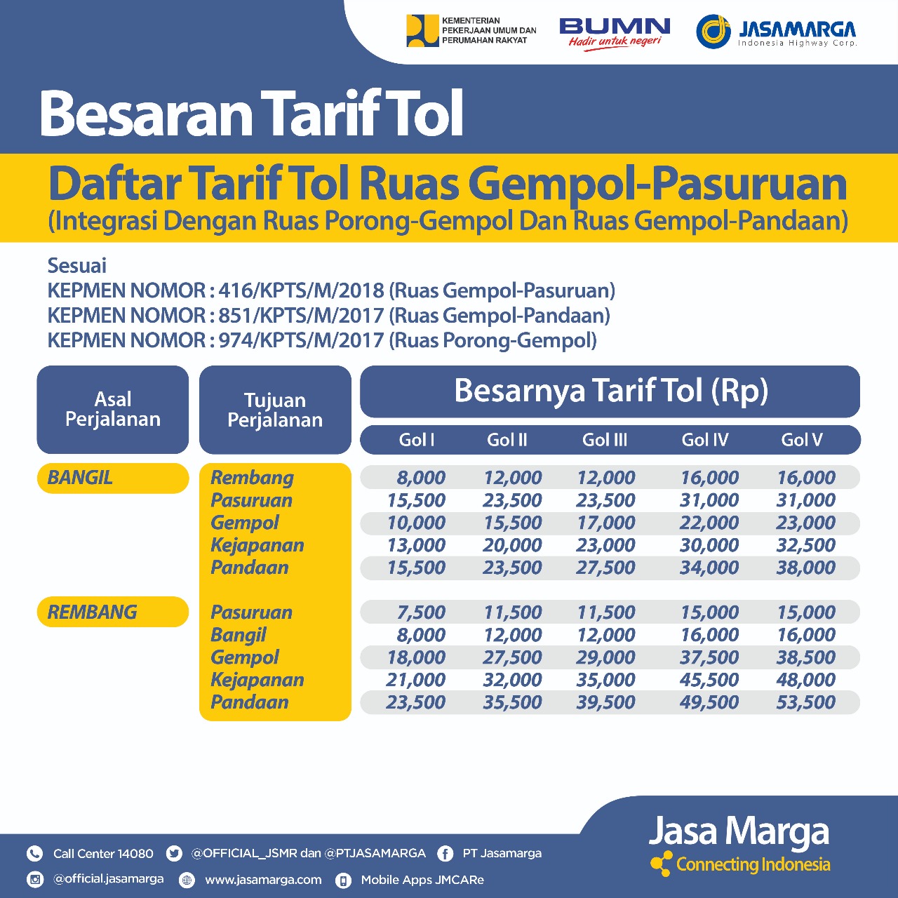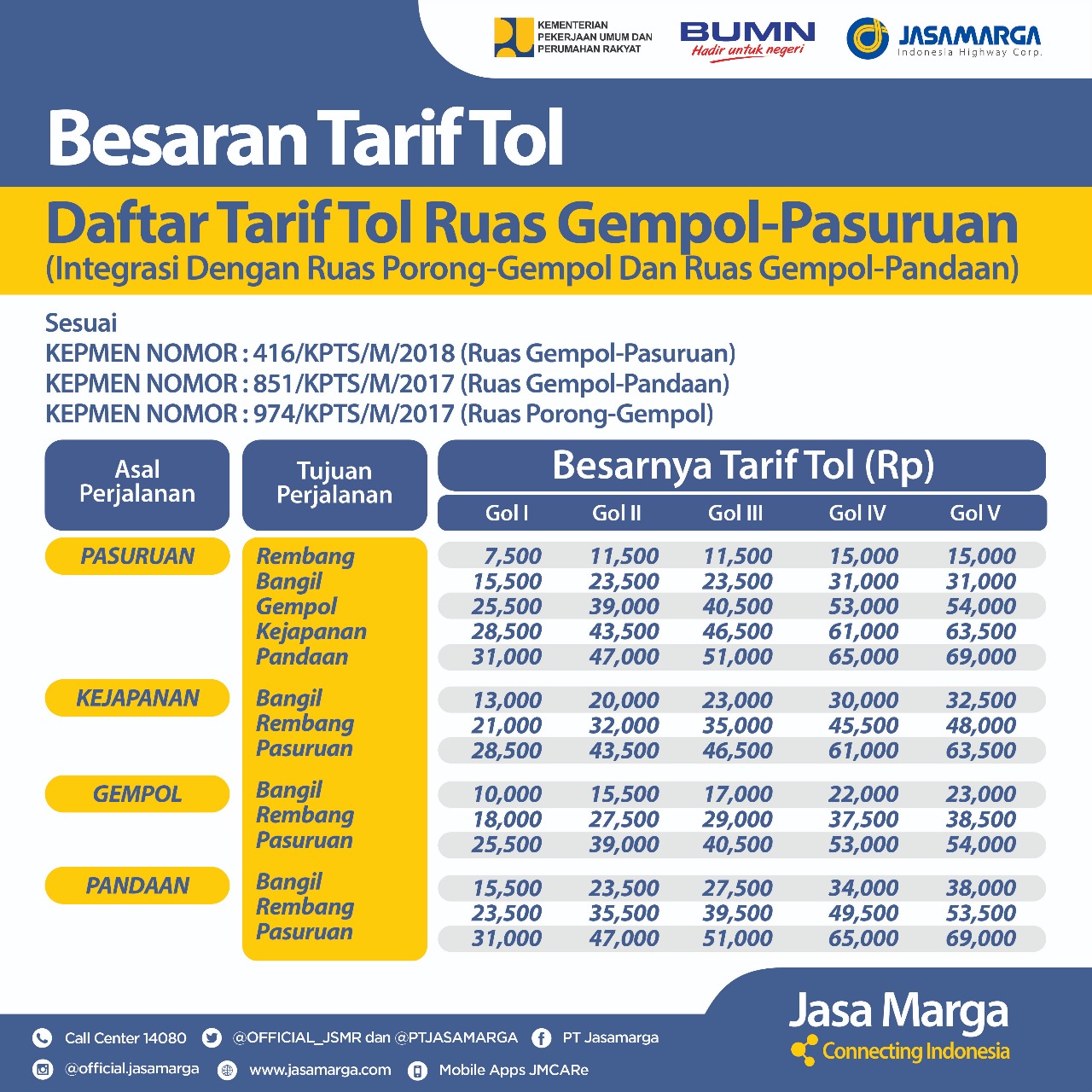 Untuk rinciannya, pengguna jalan tol golongan 1 yang masuk dari Gerbang Tol (GT) Kejapanan menuju Pasuruan akan dikenakan tarif Ruas Tol Porong – Gempol Rp 3.000, tarif Ruas Tol Gempol – Pandaan Rp 2.500 dan tarif Ruas Tol Gempol – Pasuruan Rp 23.000 sehingga total yang dibayarkan sebesar Rp 28.500.