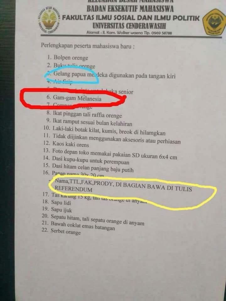 Tak hanya itu, mahasiswa baru juga diminta pengurus BEM kampus untuk membawa sejumlah barang-barang unik khas pelatihan.  Namun, dari sekian barang yang tertera dalam daftar, ada tiga atribut yang mengundang komentar yaitu gelang Papua Merdeka, Gam-gam Melanesia dan papan nama pribadi bertuliskan referendum.