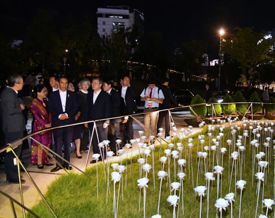 Lokasi yang dipilih adalah kawasan Dongdaemun. Tiba pukul 20.30 waktu setempat (WS), Presiden dan Ibu Iriana bersama Presiden Moon Jae-in dan Ibu Kim Jung-sook melihat taman yang dipenuhi bunga dengan cahaya lampu.