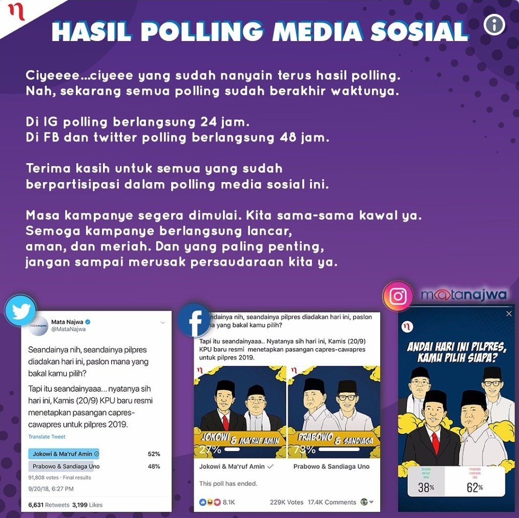 Begitupun hasil polling Mata Najwa di lini Instagram, pasangan Prabowo-Sandi tampak melesat. Mereka mengantongi suara 62 persen vote, sementara pasangan nomor urut 01 Jokowi-Ma’ruf mendapatkan 38 persen.