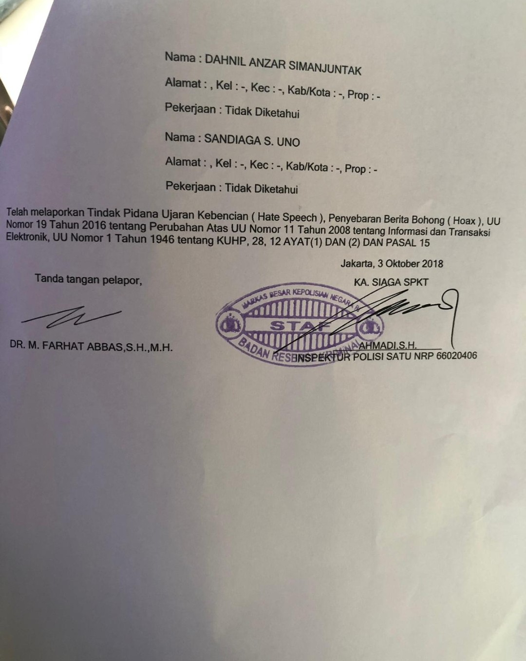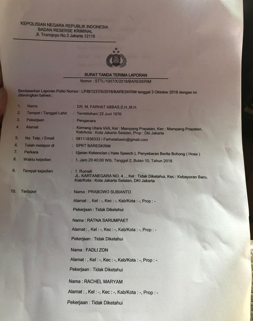 Pada keterangannya, surat tersebut ditulis berdasarkan laporan polisi nomor: LP/B/1237/X/2018/BARESKRIM tertanggal 3 Oktober 2018. Diantara nama-nama terlapor yang dicatut Farhat, adalah Ketua Umum Partai Gerindra Prabowo Subianto, Ratna Sarumpaet, Fadli Zon, Rachel Maryam, Dahnil Anzar Simanjuntak hingga Sandiaga Uno.