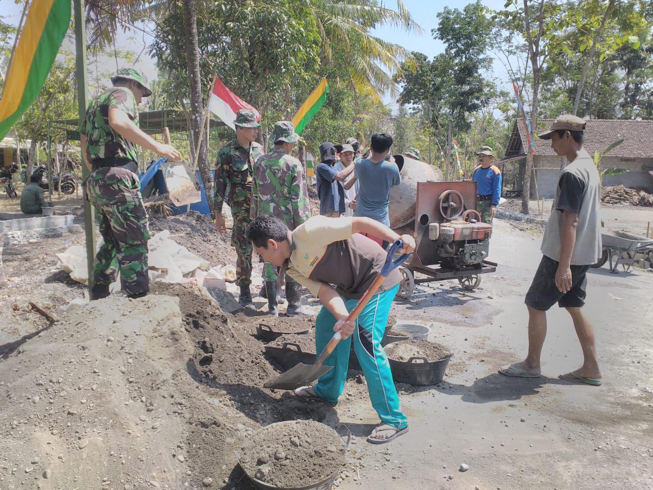 MONITOR, Sleman – Satgas TMMD Reguler ke-103 Kodim 0732/Sleman, Meski cuaca panas tak membuat semangat Prajurit dilapangan menurun tetapi malah memacu semangat prajurit dalam kegiatan pembangunan talud di Dusun Temuwuh Kidul Desa Balecatur Kecamatan Gamping, Selasa (16/10/18).