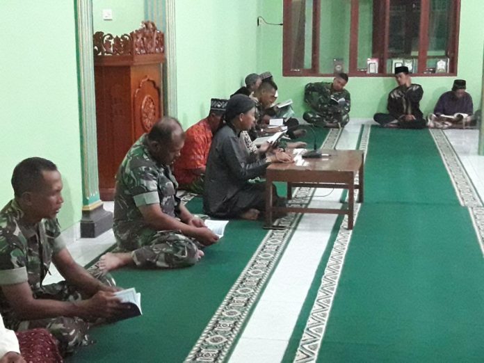 MONITOR, Sleman – Meski ditengah kesibukan menyelesaikan pekerjaan fisik maupun non fisik dalam program TNI Manunggal Membangun Desa (TMMD) ke 103, namun personel TNI dari Kodim 0732 Sleman maupun Satgas TMMD lainnya masih menyempatkan berkumpul dan berbaur bersama warga. Salah satunya dalam kegiatan yasinan bersama, Kamis malam di Masjid Nurrul jannah temuwuh,Balecatur,Gamping. Jumat 19/10/2018.