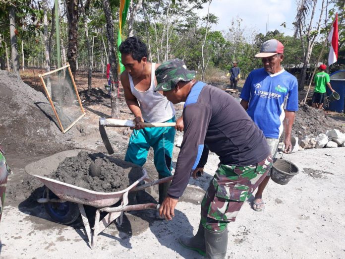 MONITOR, Sleman- TNI Manunggal Membangun Desa (TMMD) Reguler Ke-103, Kodim 0732/Sleman kembali terlihat Canda tawa Hal ini ditunjukkan oleh Serda Ramli anggota Koramil 17/Gamping bersama Warga dimana mereka pada saat dorong angkong membawa adonan semen ketempat pemasangan talut jalan yang menjadi sasaran TMMD di Desa Balecatur, Kecamatan Gamping, Kabupaten Sleman. Sabtu (20/10/18)