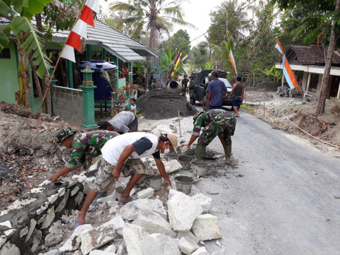 MONITOR, Sleman – Di lokasi TNI Manunggal Membangun Desa (TMMD) Reguler ke 103 Kodim 0732/Sleman, Matahari membakar kulit seakan mampu membakar daun kering yang bergelantungan di pepohonan.