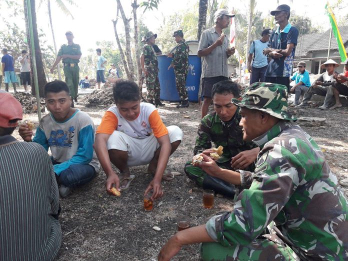 MONITOR, Sleman – Lakukan pendekatan secara humanis Serda Hermawan personel Satgas TNI Manunggal Membangun Desa (TMMD) ke-103 Kodim 0732/Sleman menyantap makanan ringan dan meminum teh manis hangat yang di hidangkan oleh masyarakat.