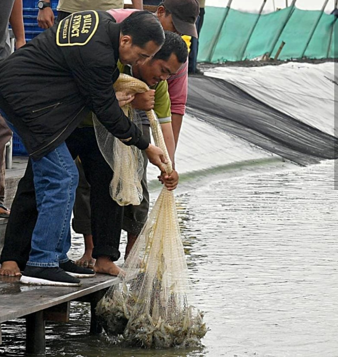 Awalnya, Jokowi dan sejumlah petambak menarik jaring berisi udang. Saat jaring ditarik, ratusan udang pun berlompatan.