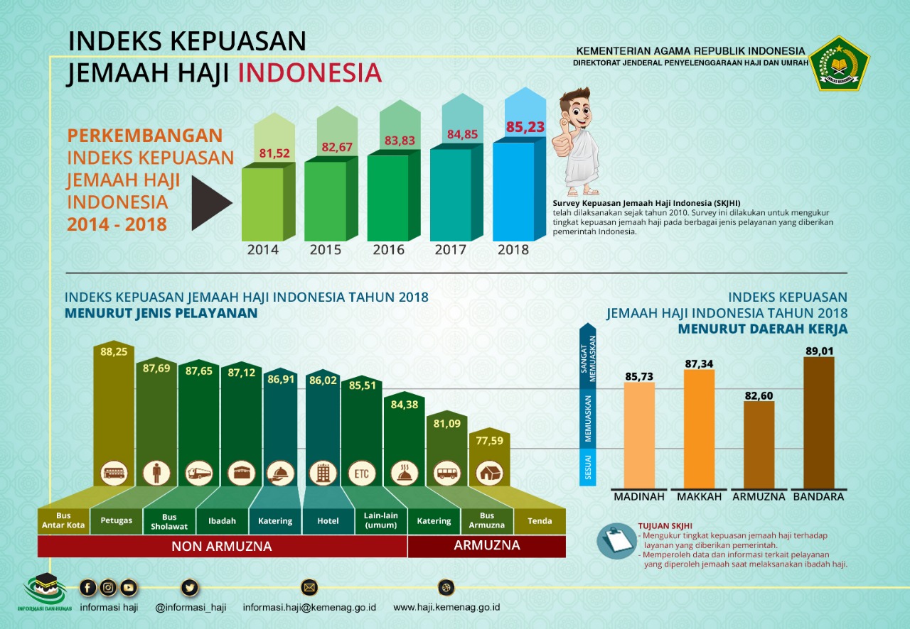Capaian kinerja Kementerian Agama dalam empat tahun terakhir juga sangat nampak dari penilaian masyarakat terhadap penyelenggaraan ibadah haji. Penilaian itu tercermin dalam Indeks Kepuasan Jemaah Haji Indonesia (IKJHI) hasil survei Badan Pusat Statistik (BPS).
