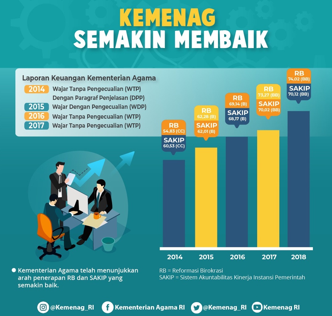Reformasi Birokrasi (RB) di Kemenag juga bergeliat. Ini bisa dilihat dari indeks penilaian yang dilakukan oleh Kementerian Pemberdayaan Aparatur Negara dan Reformasi Birokrasi (Kemen PANRB). Kalau pada tahun 2014, indeks RB Kemenag baru 54,83 atau masuk kategori “CC”, perlahan angkanya naik menjadi 62,28 atau “B” (2015), 69,14 atau “B” (2016), 73,27 atau “BB” (2017), dan 74,02 atau “BB” (2018).