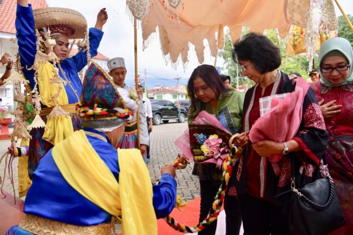 MONITOR, Bone – Pengurus Organisasi Aksi Solidaritas Era Kabinet Kerja (OASE Kabinet Kerja) Sri Mega Darmi Sandjojo (Riri Sandjojo) bersama Koesni Harningsih Moeldoko berkunjung ke Kabupaten Bone, Sulawesi Selatan, Rabu (10/4). Kedatangan mereka disambut tari Alusu yang merupakan tari penjemputan adat Bone.