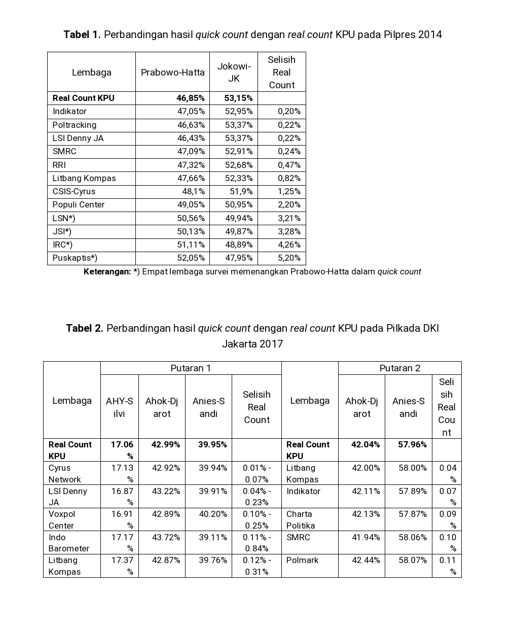 Selisih antara quick count dan real count berkisar di bawah 1 persen hingga maksimal 2 persen saja. Menurut Endang, kontroversi terkait hasil quick count dimulai sejak Pilpres 2014. Ada empat lembaga survei yang memenangkan Prabowo-Hatta, yaitu Pusat Kajian Kebijakan dan Pembangunan Strategis (Puskaptis), Indonesia Research Center (IRC), Jaringan Survei Indonesia (JSI), dan Lembaga Survei Nasional (LSN).