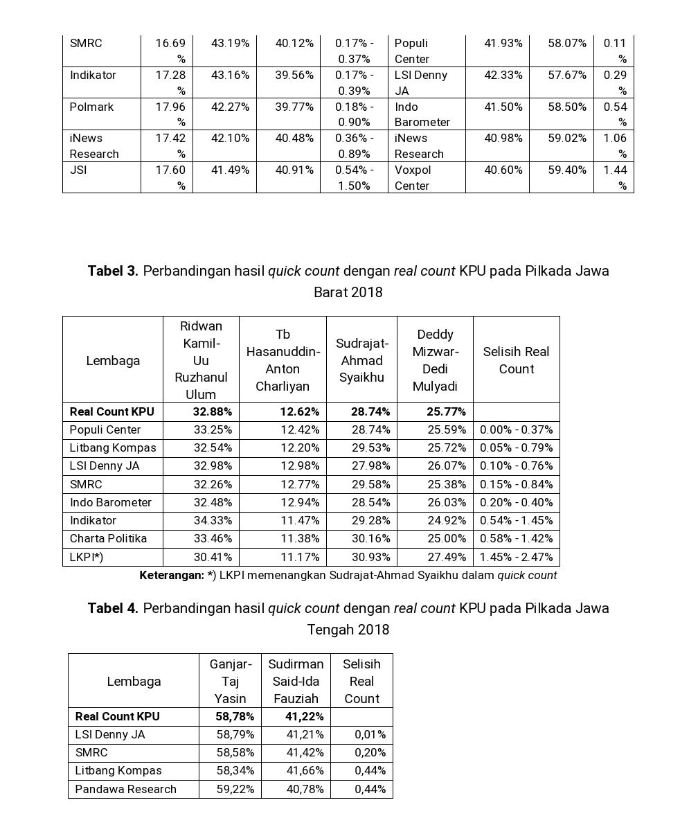 “Selain empat lembaga tersebut, ada pula Lembaga Kajian Pemilu Indonesia (LKPI) yang merilis hasil berbeda pada Pilkada Jawa Barat dan Jawa Tengah pada 2018,” lanjut Endang.