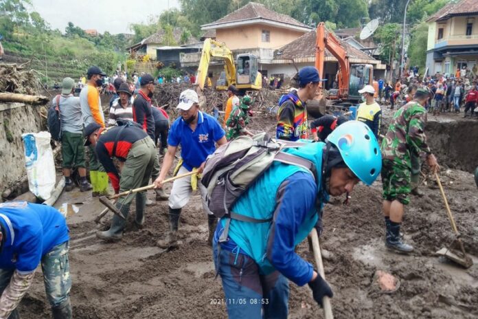 Relawan Blue Helmet Pasuruan Raya didampingi Ketua DPW Partai Gelora Jatim Muhammad Sirot langsung menuju Desa Punten Kota Batu, daerah yang terdampak cukup parah sekaligus tempat penampungan pengungsi.