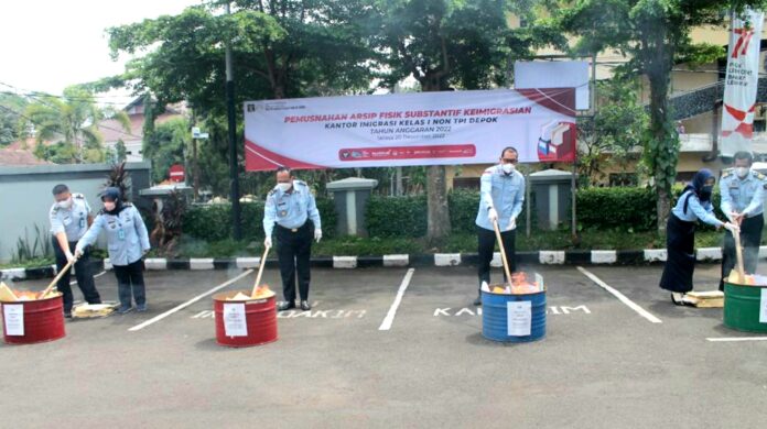 MONITOR, Depok – Kantor Imigrasi Kelas I Non TPI Depok memusnahkan Arsip Fisik Fasilitatif dan Substantif Keimigrasian Tahun Anggaran 2022, bertempat di lapangan parkir Kantor Imigrasi Depok, Selasa (20/12/2022).