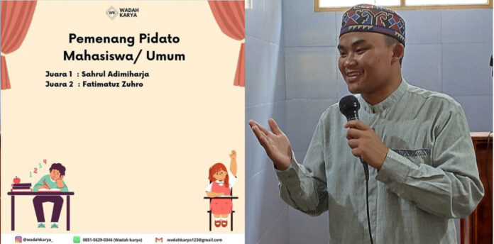 MONITOR, Bandung – Prestasi membanggakan kembali diraih mahasiswa Jurusan Komunikasi dan Penyiaran Islam, UIN SGD Bandung, Sahrul Adimiharja, yang berhasil meraih Juara 1 Lomba Pidato tingkat Nasional yang diselenggarkan oleh Wadah Karya.