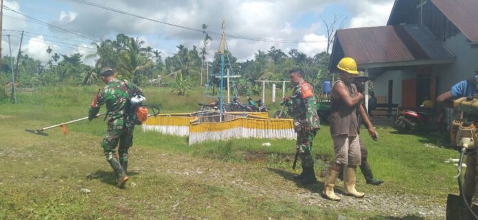 MONITOR, Mimika – Dalam rangka mempererat tali silaturahmi dalam kerukunan umat beragama, Babinsa Koramil 1710-07/Mapurujaya melaksanakan kerja bakti pembersihan Gereja Katholik Santa Theresia Calkuta Kp. Muare, Distrik Mimika Timur, Kab. Mimika, Sabtu (4/2/2023).