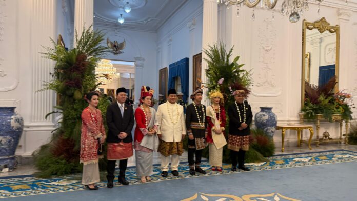 Usai upacara detik-detik Proklamasi untuk HUT ke-80 RI di Istana Merdeka, Puan tampak berfoto bersama dengan Presiden Prabowo Subianto yang mengenakan baju adat Demang dan Kain Ujung Serong khas Betawi.