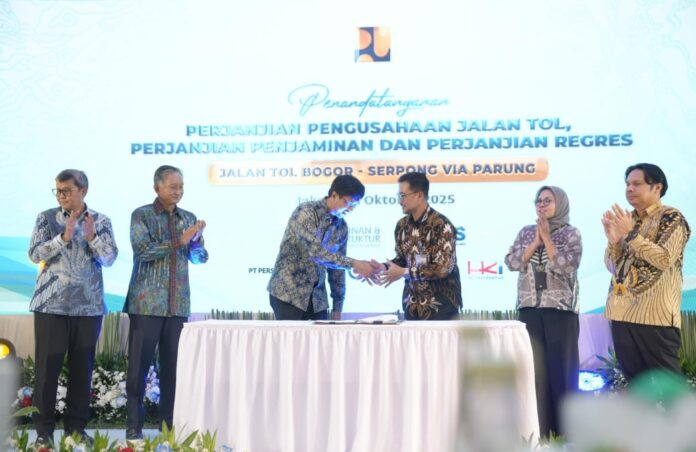MONITOR, Jakarta – PT Bogor Serpong Infra Selaras (BSIS) selaku Badan Usaha Jalan Tol (BUJT) yang dibentuk oleh Konsorsium Swasta-Badan Usaha Milik Negara (BUMN) beranggotakan PT Persada Utama Infra (PUI), PT Jasa Marga (Persero) Tbk (JSMR), PT Adhi Karya (Persero) Tbk (ADHI), dan PT Hutama Karya Infrastruktur (HKI) menandatangani Perjanjian Pengusahaan Jalan Tol (PPJT) dan Perjanjian Penjaminan Jalan Tol Ruas Bogor – Serpong (via Parung). Selain itu, Perjanjian Regres juga turut ditandatangani di Pendopo Kementerian Pekerjaan Umum (PU) Jakarta pada Jumat (03/10).