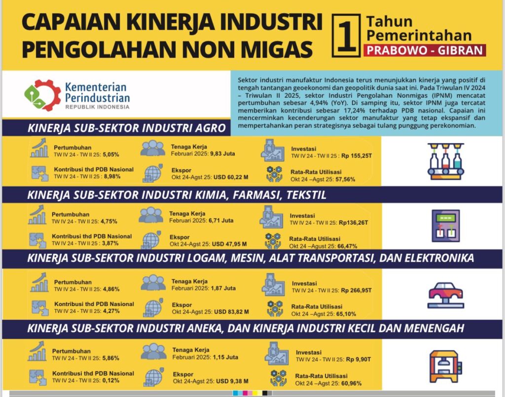 MONITOR, Jakarta – Kementerian Perindustrian melaporkan capaian kinerja positif Industri Pengolahan Non Migas (IPNM) sepanjang satu tahun pemerintahan Presiden Prabowo Subianto dan Wakil Presiden Gibran Rakabuming Raka.