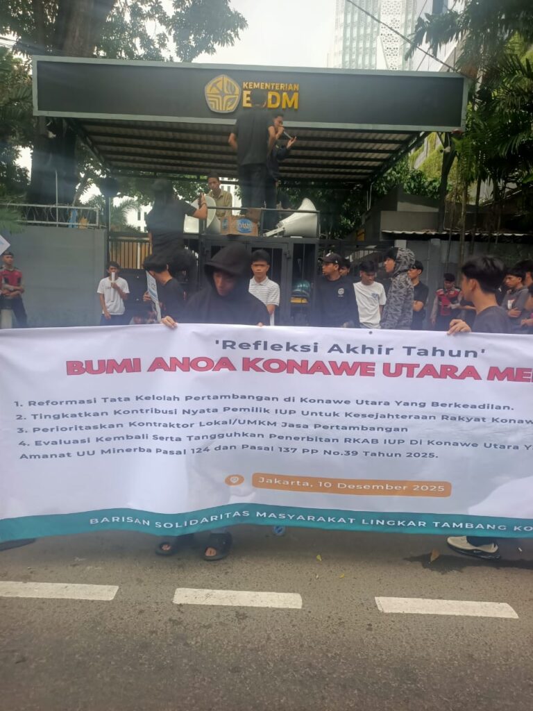 MONITOR, Jakarta – Barisan Solidaritas Masyarakat Lingkar Tambang Konawe Utara (Basmalaku) menggelar Aksi Damai. Lokasi aksinya adalah Kantor Kementerian Energi dan Sumber Daya Mineral (ESDM) RI, Jakarta. Mereka menuntut reformasi tata kelola pertambangan nikel di Konawe Utara (Konut), Rabu (10/12/2025)
