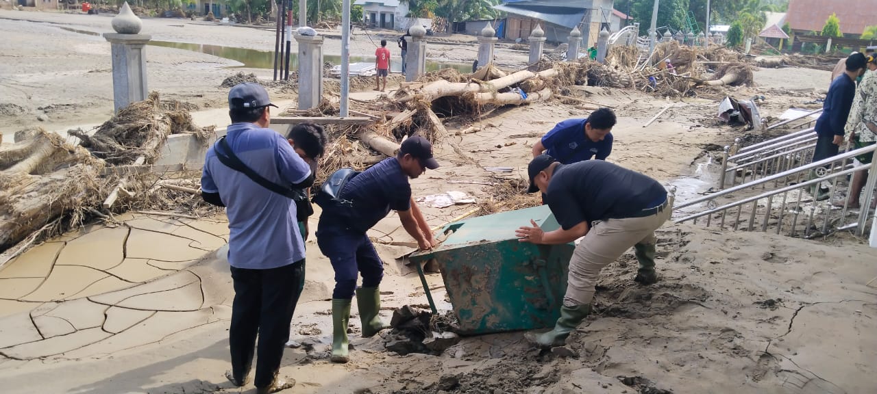 Bersih-bersih ini melibatkan sejumlah ASN. Mereka bekerja sama membersihkan lumpur, sampah, dan material lainnya yang terbawa banjir ke area masjid.