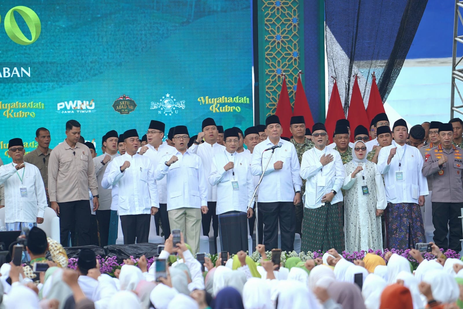 Hadir juga, Rais Aam PBNU KH Miftachul Akhyar, Ketua Umum PBNU KH Yahya Cholil Tsaquf, serta jajaran Syuriyah dan Tanfidziyah PBNU. Tampak hadir, para menteri Kabinet Merah Putih, Ketua MPR, Ketua MUI, Kapolri, Panglima TNI, Gubernur Jawa Timur Khofifah Indar Parawansa, kepala daerah, serta tokoh-tokoh nasional lainnya.