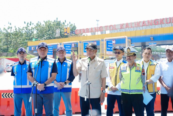 MONITOR, Semarang – Direktur Utama PT Jasa Marga (Persero) Tbk Rivan A. Purwantono mendampingi tinjauan Menteri Pekerjaan Umum (PU) Dody Hanggodo untuk memastikan arus balik Idulfitri 1447H/2026 berjalan terkendali dengan dukungan kesiapan infrastruktur jalan tol yang aman dan nyaman bagi pengguna jalan di di Gerbang Tol (GT) Kalikangkung Jalan Tol Batang-Semarang pada Sabtu (28/03). Turut hadir dalam kegiatan ini, Direktur Bisnis Jasa Marga Reza Febriano, Kepala Badan Pengatur Jalan Tol Kementerian PU Wilan Oktavian, Dirlantas Jawa Tengah Kombes Pol M. Pratama Adhyasastra, beserta jajaran terkait.